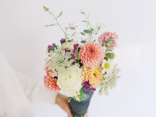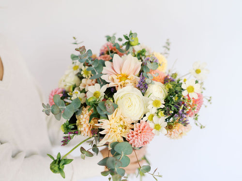 Our photos will give you a basic idea of size and aesthetic for every arrangement but please know that each order is customized based on seasonal availability and any directions given in your order notes.