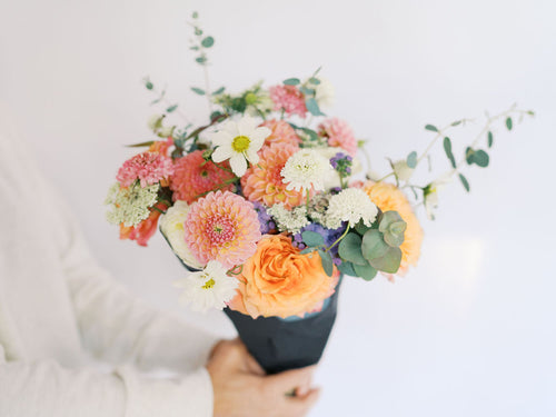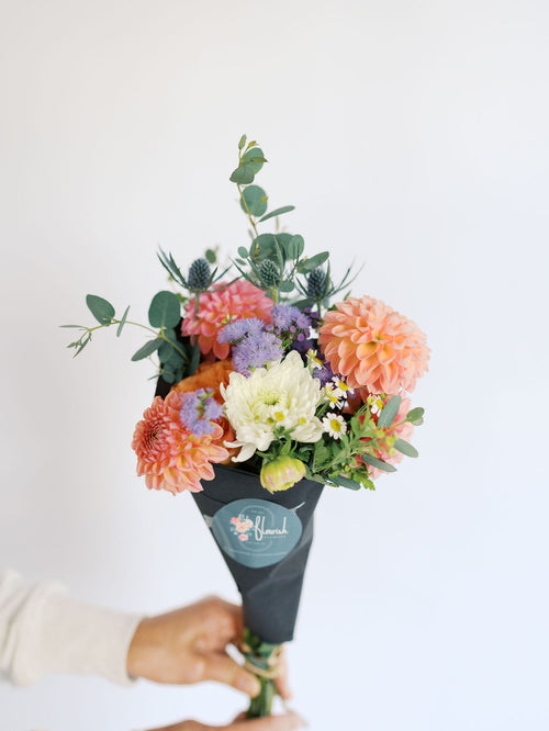 Choose a size from small, medium and large bouquets. Surrounded by elegant black paper, each bouquet is arranged with fresh seasonal flowers to create a signature Flourish Flowers arrangement. Send to a friend or loved one or pick one up at the Flourish barn to display at home!